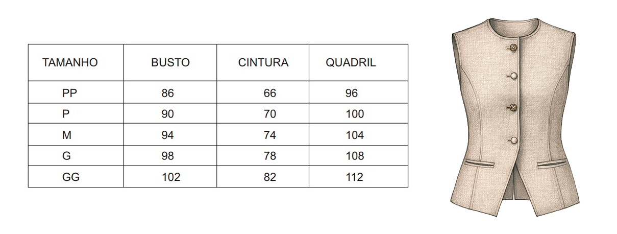 Com forro macio e acabamento impecável, garante conforto e qualidade. Os botões diferenciados dão o toque final de estilo, tornando o colete perfeito para composições clássicas ou modernas.